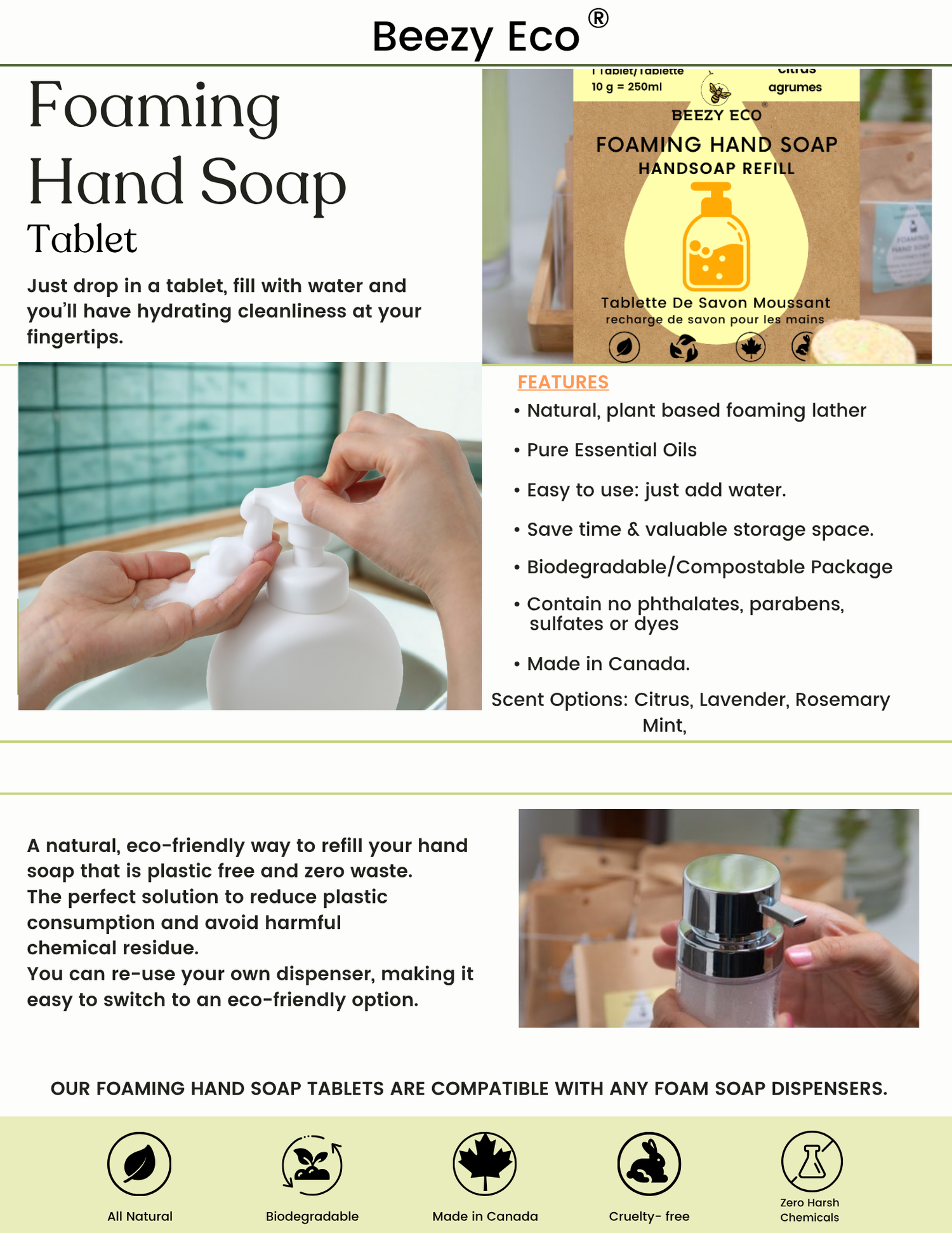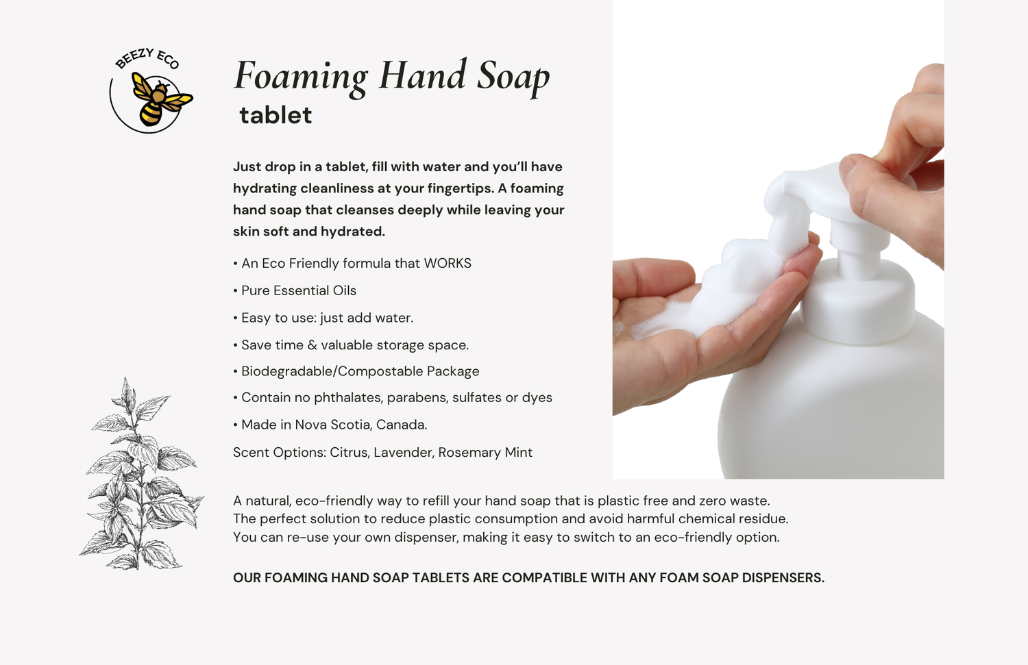 Fresh, practical, and beautifully simple: drop the mint and citrus refill tablets into your foamer bottles, glide the solid dish bar over your sponge, and swap cling wrap for a moldable beeswax roll that keeps food happy. The sink smells bright, the countertop looks calm, and you’ve just cut plastic without sacrificing ease. Smart, giftable, and proudly women-owned in Canada.